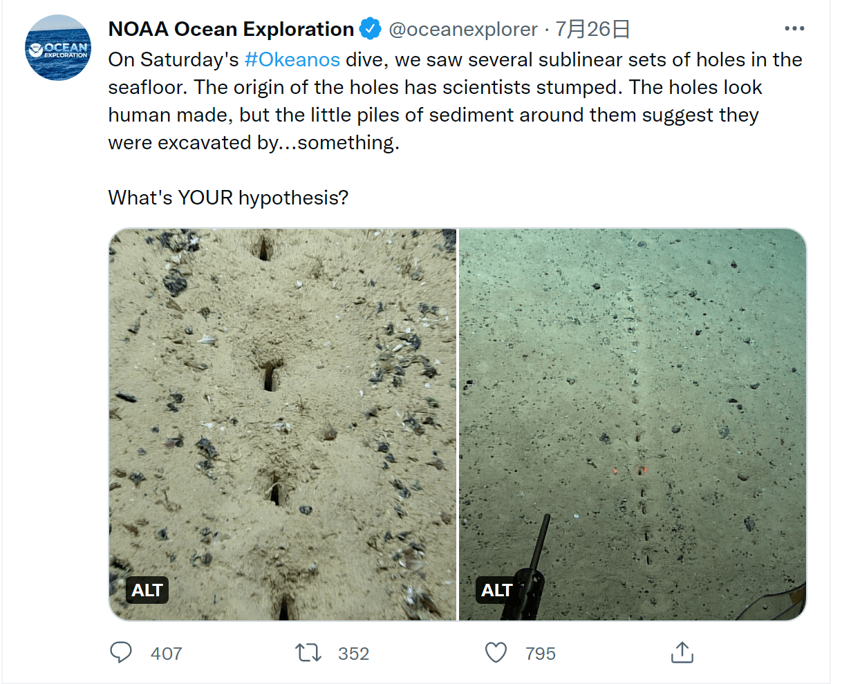 The NOAA Ocean Expedition Research Team released photos of these mysterious holes on social media on the 26th, and encouraged the majority of netizens to express their opinions. This interesting challenge has attracted many responses. Some netizens ridiculed: “These holes are like perforated lines, probably to make the seabed easier to separate…” Some netizens commented that these holes may be traces left by aliens. Some netizens believe that this may also be the site of an ancient civilization.