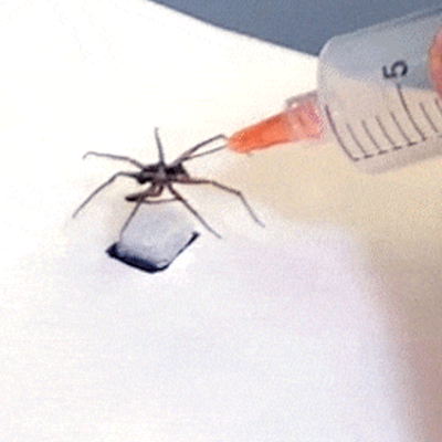 Researchers worked with wolf spiders, and began by euthanizing them in cold temperatures. A needle was then inserted into the spider’s body, and sealed with glue. This allowed the hydraulic passages inside the spider to be pressurized with air to extend the legs. Releasing the pressure lets the legs contract again into the curled up position.