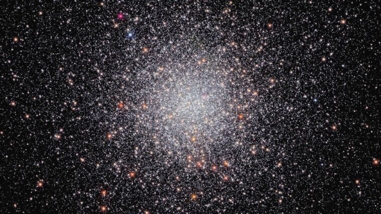 A new image of deep space reveals a distant globular cluster of tightly packed stars filled with stellar bodies like a swarm of glittering bees swarming around a cosmic beehive.