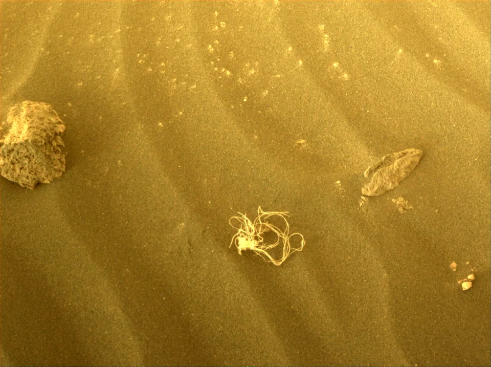 The material is not of alien origin, biological or otherwise, but is instead a piece of tangled Dacron netting from the entry, descent and landing (EDL) gear that landed the rover on the Martian surface in February 2021.