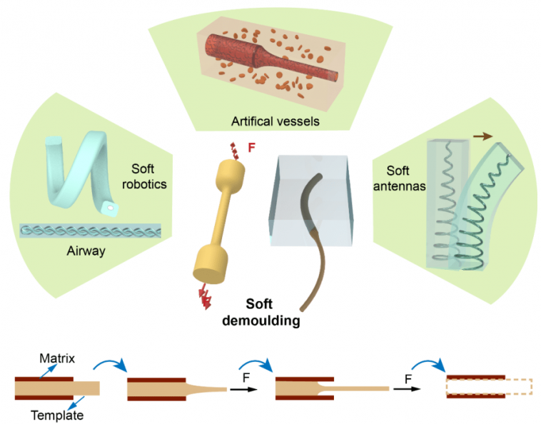 Under stress, the cross section of the soft formwork will become thinner, so that the demoulding process of the soft formwork becomes a peeling process that is no longer sensitive to the shape and length of the formwork, thereby greatly reducing the cost of removing the formwork. The external force required is suitable for a variety of soft matrix materials, and can be used to prepare complex, high aspect ratio microchannels, and has application potential in the fields of soft robots, wearable sensors, and organ chips.