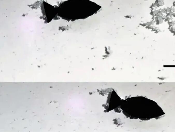 The black robot fish is irradiated by a light, helping it to flap its fins and wiggle its body. Scientists can control the fish using the light to avoid it crashing into other fish or ships.