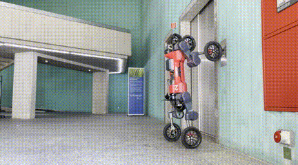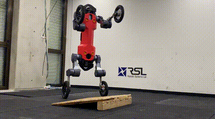 This is Swiss-Mile, a quadruped wheel-legged robot with the same name as the company developed by a spin-off company of the Swiss Federal Institute of Technology in Zurich, Switzerland, formerly known as ANYmal quadruped robot.