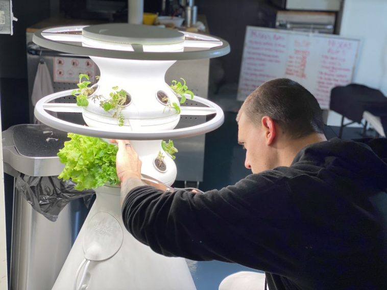 Bioscience Officer Jason Fischer harvests lettuce from a Lettuce Grow hydroponics greenhouse at HI-SEAS during an analog space mission, taking place on Earth.